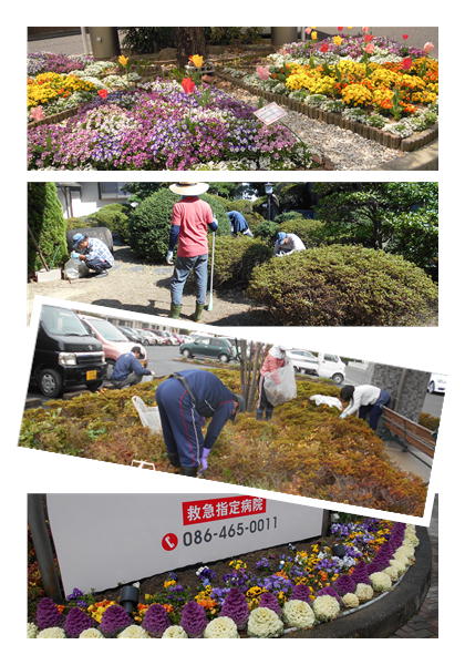 倉敷市内病院関係、老人ホーム関係先での花壇整備、除草・花苗の植込み作業風景です。